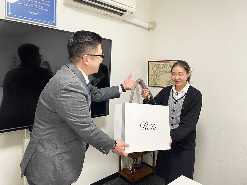 先日、物流事務として勤務している社員の二十歳のお祝いをしました。 社長より「二十歳という節目を迎え、これからますますの成長を期待しています。」と温かいお祝いの言葉が贈られました。 あわせて、本人のリクエストのReFa…